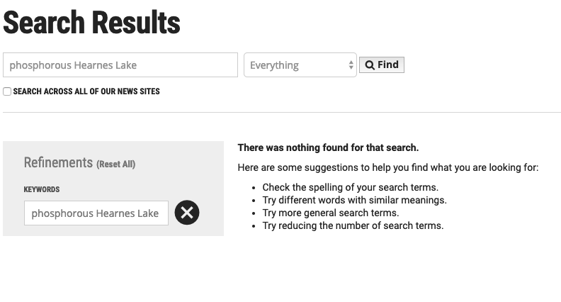 Let's focus on two key parts: Hearnes Lake and phosphorous. Surely that's enough for a concerned citizen to discover this important reporting? Let's see...
