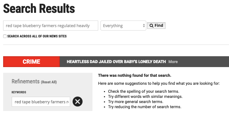 Success! It exists but the online edition has a different title: "Is there too much red tape for our blueberry industry?".